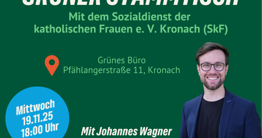 Am Mittwoch, 19.11.2025 ab 18 Uhr besucht uns bei unserem Stammtisch der Sozialdienst katholischer Frauen e. V. (SkF) aus Kronach. Gemeinsam mit unserem Bundestagsabgeordneten Johannes Wagner wollen wir darüber diskutieren, wie sich Sozialpolitik kommunal und bundesweit besser gestalten lässt.